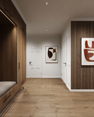 У цій квартирі, яка виблискує те плими кольорами та дерев'яними акцентами, відчувається приємний домашній затишок. Це місце, де кожен елемент інтер'єру вибраний з особливою увагою до деталей, а кожен куток віддзеркалює тепло та комфорт.